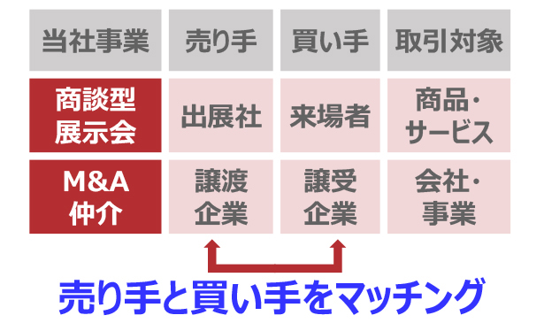 商談型展示会というのは、一言でいうと、商品の売り手と買い手をマッチングする事業です。東京ビッグサイト等の巨大な展示会場に、売り手であるメーカーやサプライヤーに商品を展示していただいて、そこに買い手であるバイヤーを集めてきて、売り手と買い手をマッチングする。これが、商談型展示会という事業です。そして、M&A仲介事業ですが、売り手と買い手をマッチングするという点は同じですが、その対象となるのが「会社のそのもの」で、いわゆる企業買収や譲渡のマッチングを行う事業です。
