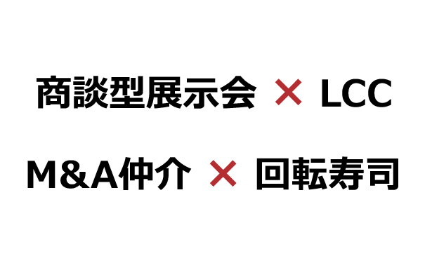 具体的には、「商談型展示会 × LCC」、「M&A仲介 × 回転寿司」という、全く新しい独自のビジネスモデルで事業を展開しています。