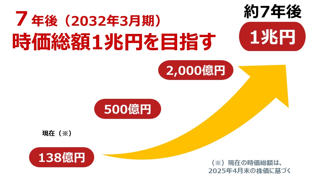 当社では、7年後(2032年3月期)までに、時価総額を1兆円にする、という目標を掲げています。