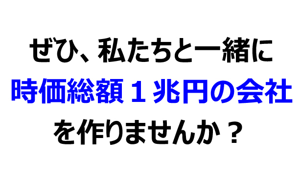 今、時価総額1兆円の企業にしたい、と言いましたが、今から、1兆円規模の会社に入っても、歯車の一つに過ぎませんが、これから1兆円を目指す会社が目の前にあり、その会社が、まだ100分の1ぐらいの規模の時に入社し、7年後に1兆円の企業にすることが出来れば、とてつもない実力がつくと思いますし、エキサイティングだと思いませんか? 私たちのビジョンに、ワクワクしたり、「これだ!」と感じたものがあったなら、ぜひとも当社に入社いただきたいと思います。